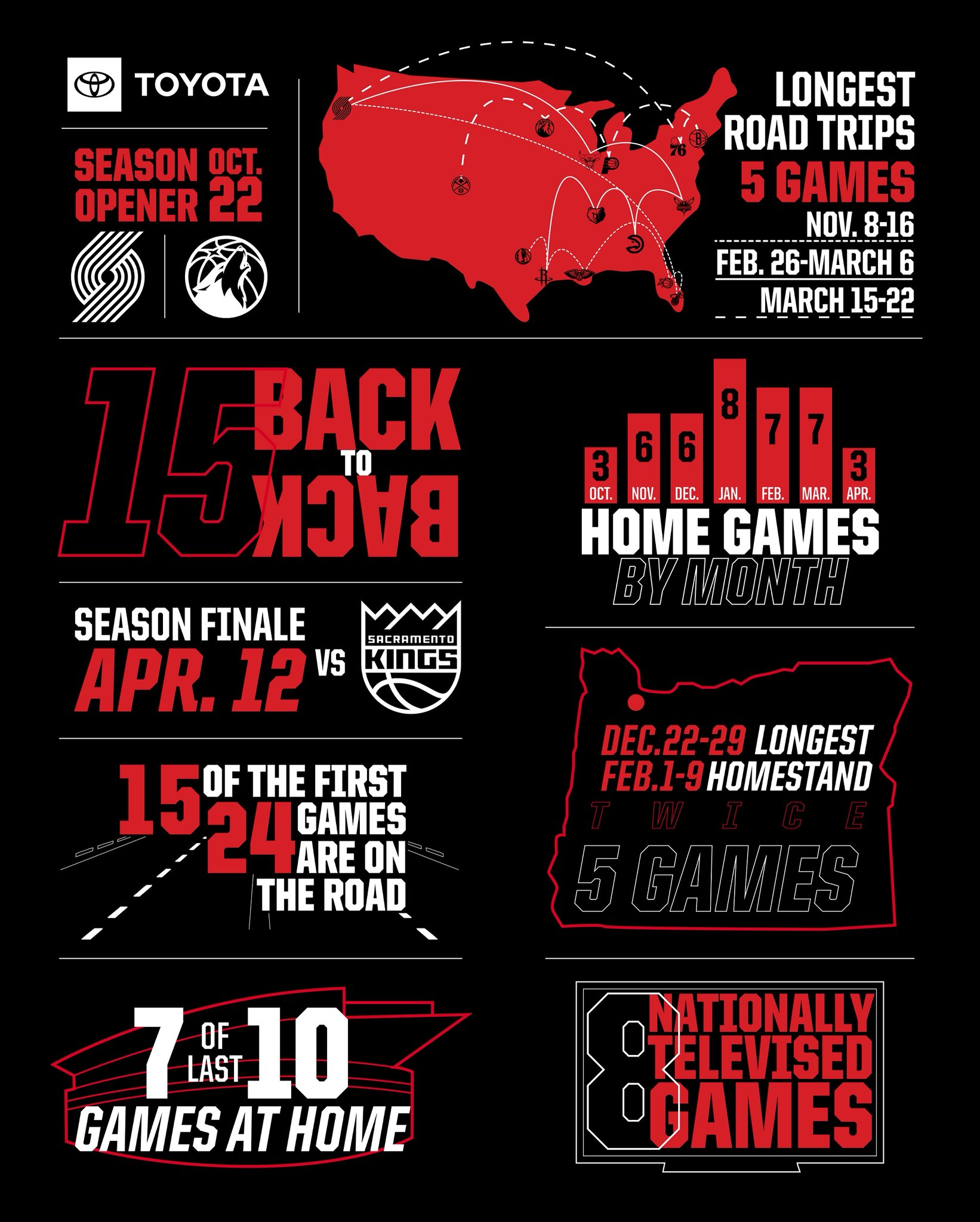 开拓者队的赛程中有15组背靠背比赛,包括2月7日和8日连续两个主场对阵灰熊队;两个长达五场的主场赛程(12月23日-30日、2月2日-10日);以及三个长达五场的客场之旅(11月9日-17日、2月27日-3月7日、3月16日-23日)。